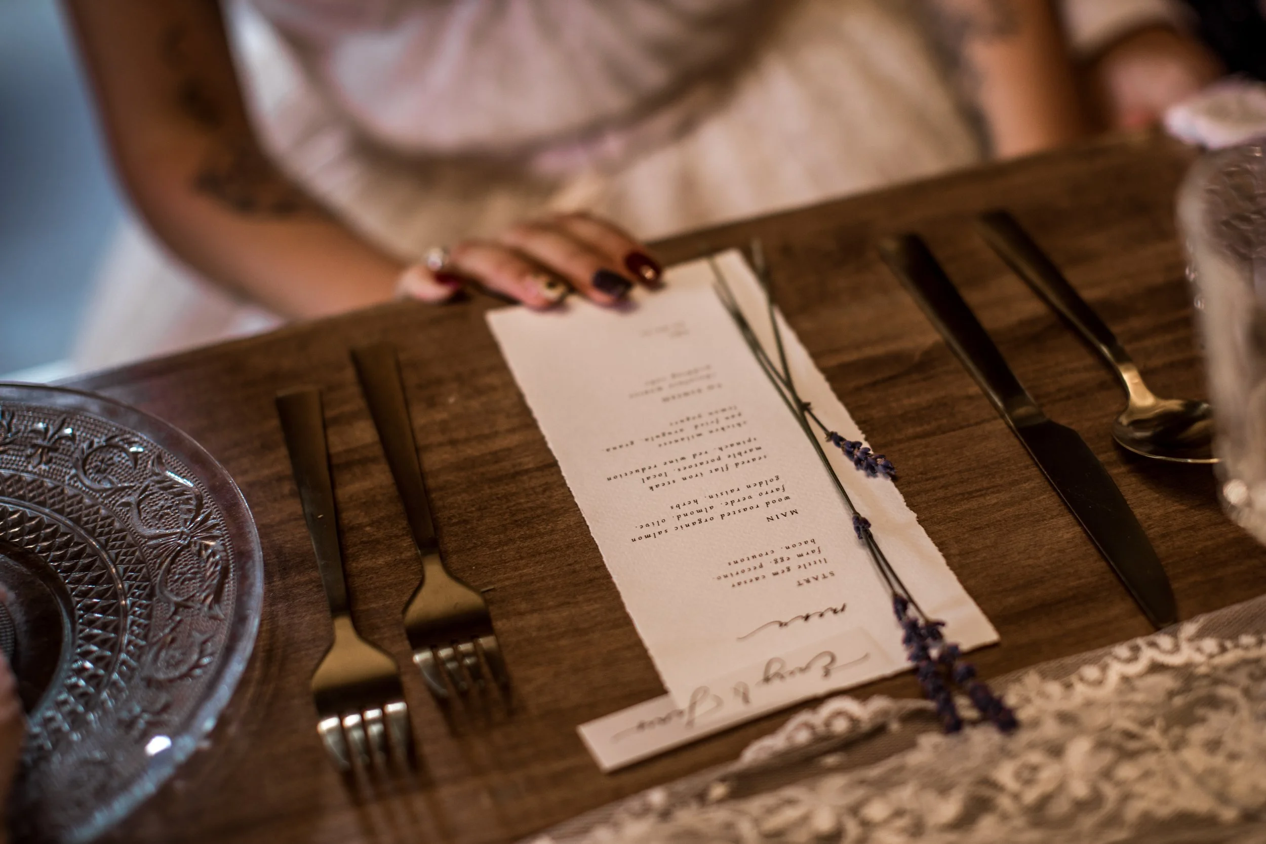When I came across the lavender, the table design just clicked. The lavender sprig was a perfect addition to the menu card placements. The “Pick Your Seat” place cards with the woodandwordblooms flowers was something Kathy and I collaborated on doing as a way for the guests to build their own centerpieces as they took their seat, adding an interactive element to their evening.